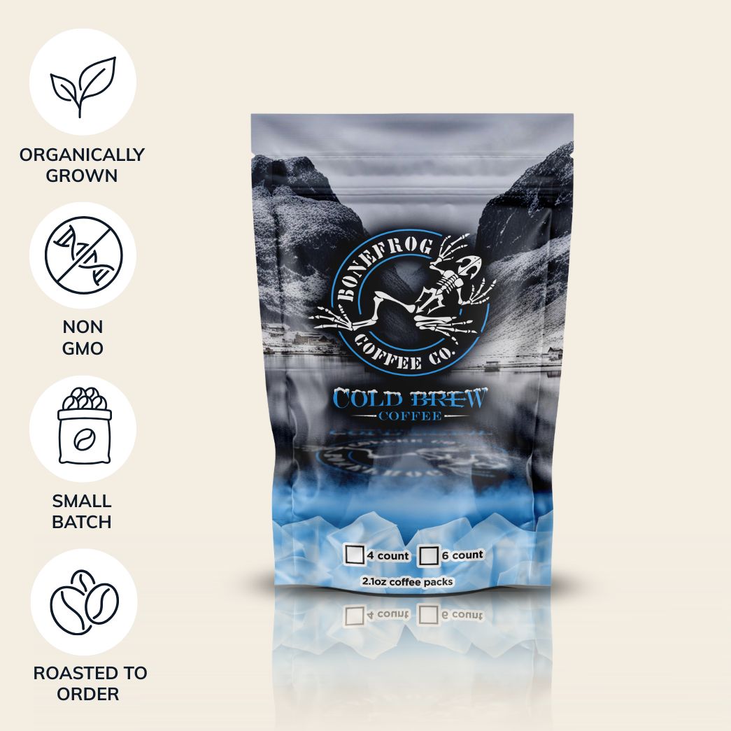 Our Cold Brew Coffee Packs are just what you need to make cold brew at home. Place two pouches into filtered cold water, let steep for 24 hours in the fridge. Try our Original Bonefrog® Roast over ice, the rich taste will quickly have you hooked.