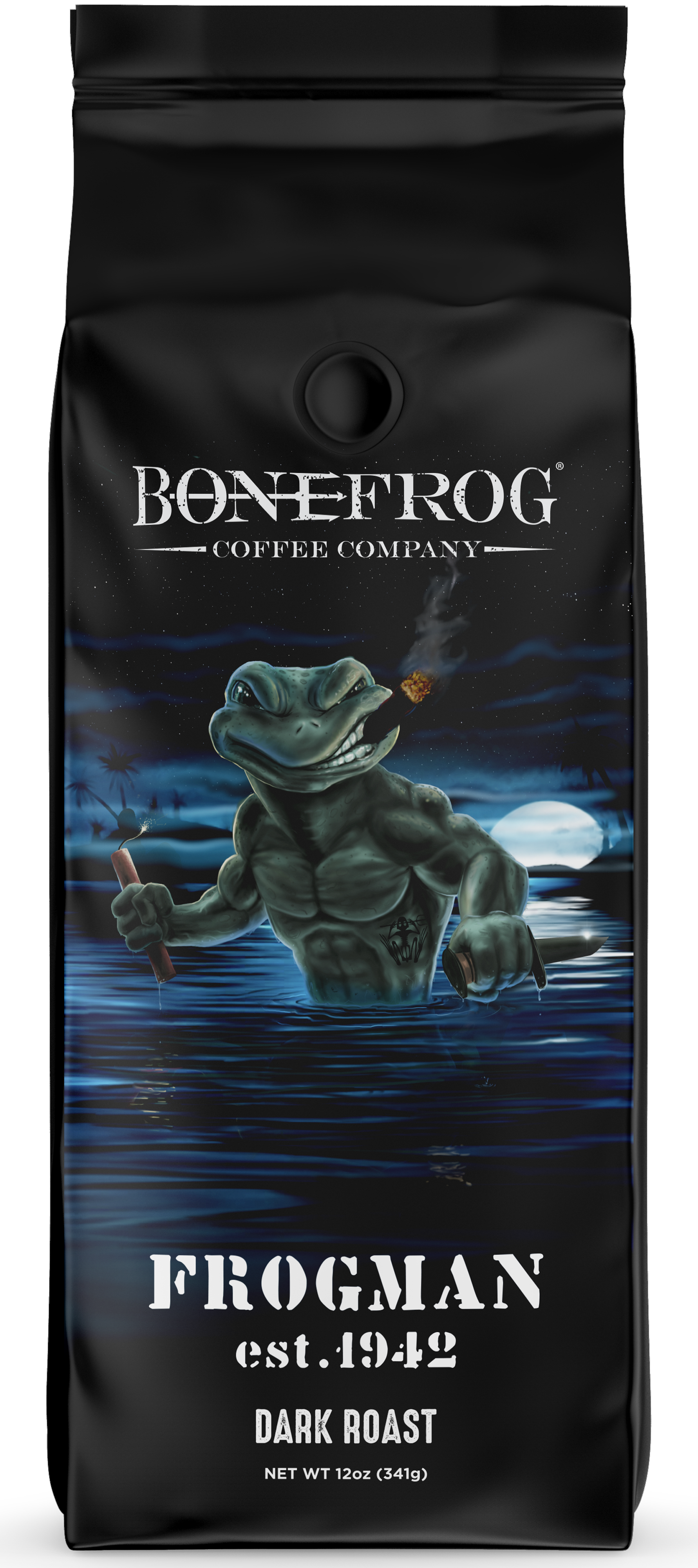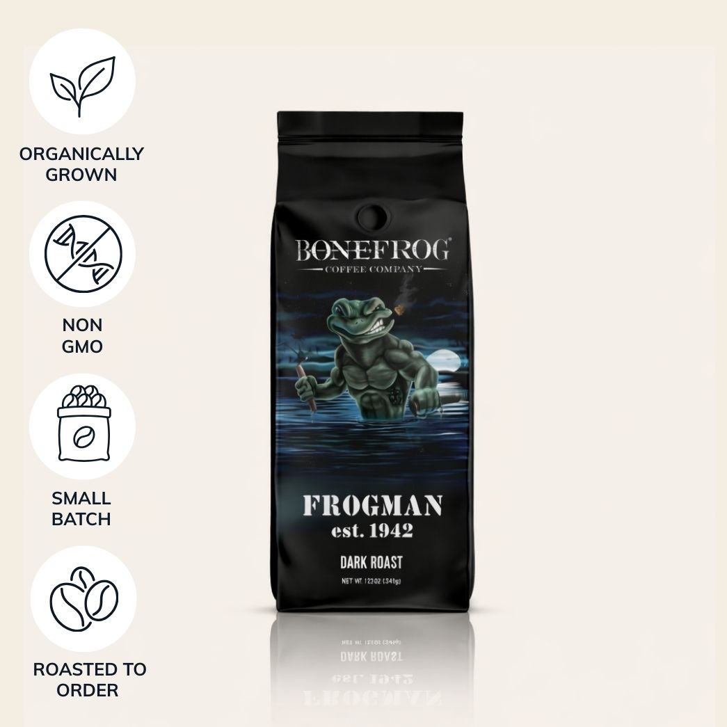 Our Frogman Dark Roast Gourmet Coffee is specially crafted to honor the valor and sacrifice of combat divers, known as Frogmen, during World War II. As the legacy of the Frogmen is carried on through our Navy SEAL brothers today, we remember those who courageously fought for freedom and held the motto of God, Country, Team above all else.