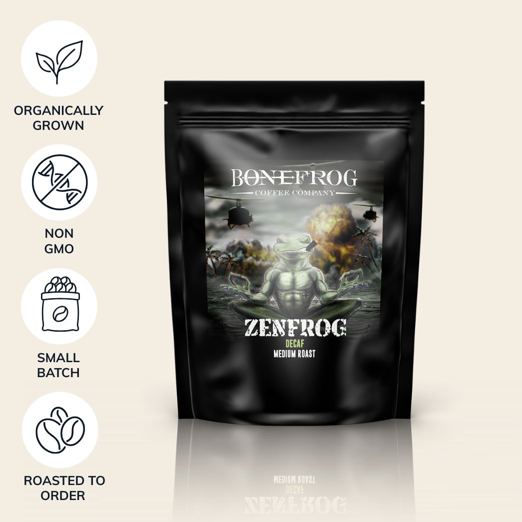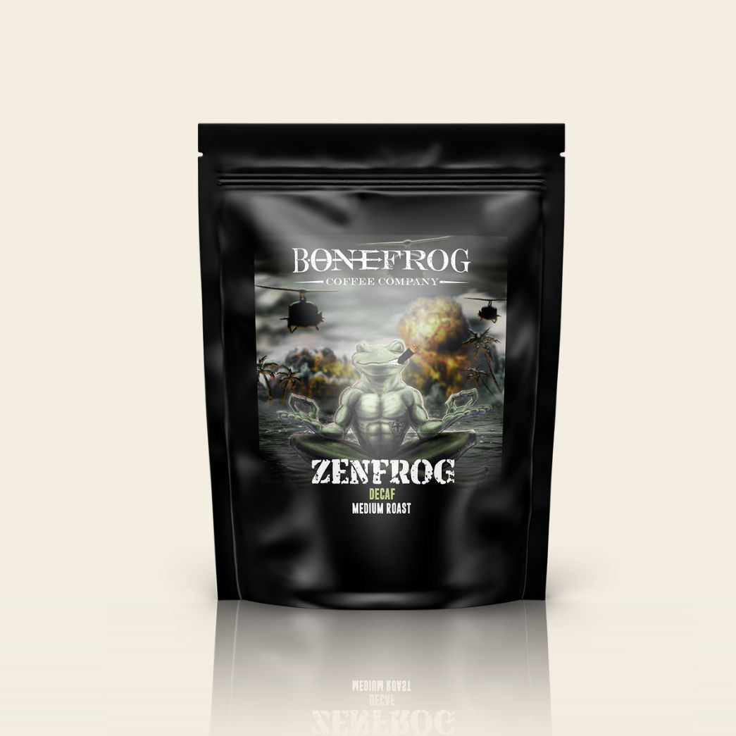Find your zen anytime of the day with our Zenfrog Decaf gourmet coffee blend. Swiss Water® processed and 100% chemical free, this full-bodied, medium roast is brimming with rich flavors and a smooth finish without the caffeine. We’ve carefully selected beans sourced from Brazil, Ethiopia, Indonesia, and Papua New Guinea to craft a superior decaf blend you’ll look forward to every day!